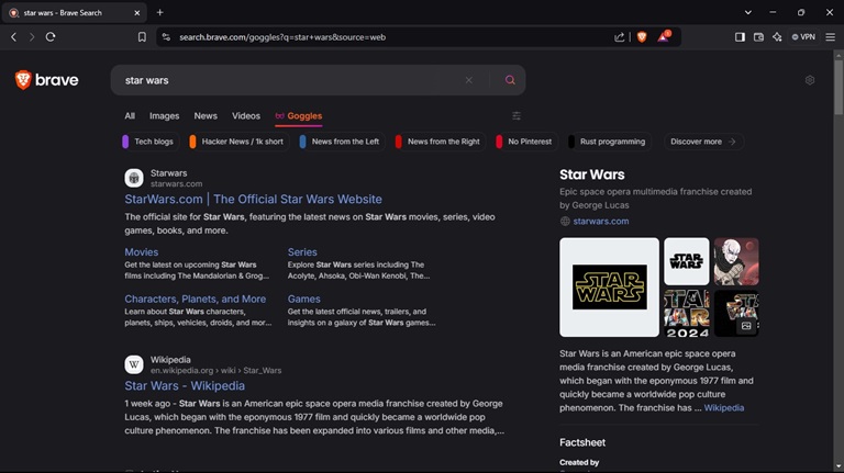 These filters are available to all Brave Search users via the Goggles tab, offering a fresh way to explore the internet. Want to read the news without worrying about bias? Pick your side, or just experiment for a different perspective. Tired of big tech dominating your search results? Let the 1K Short Goggle take the reins.