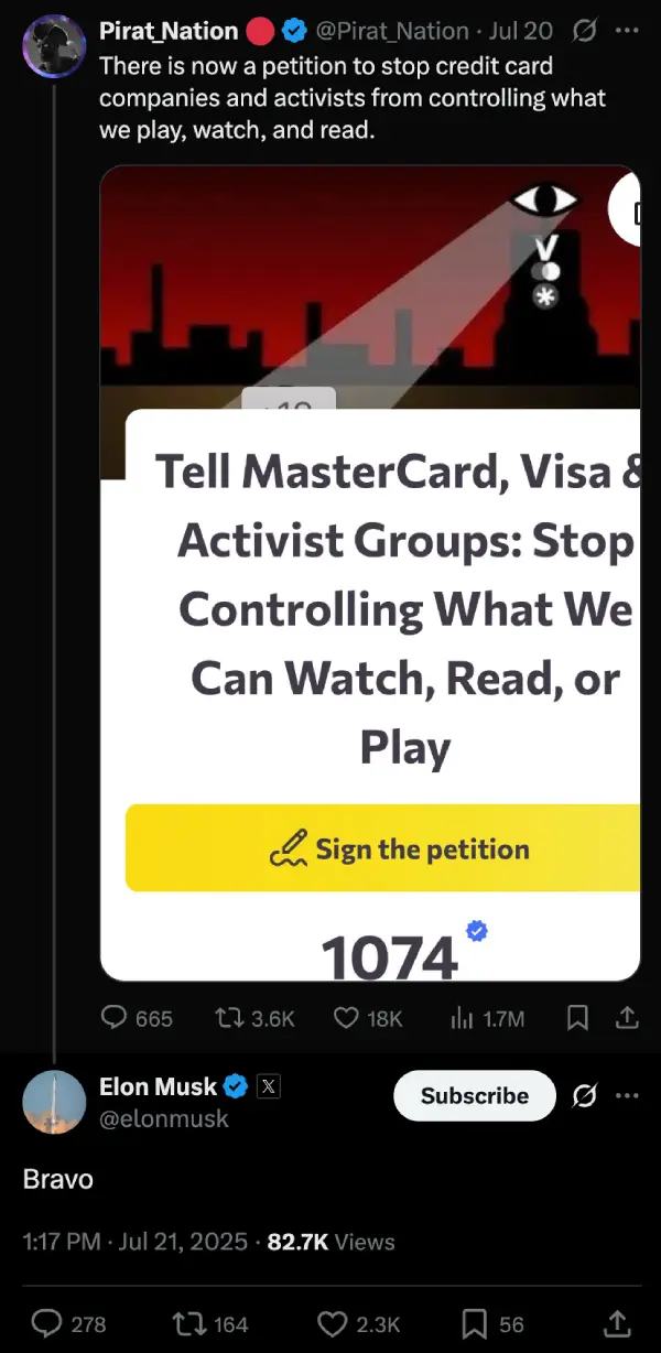 You know how the internet works – tell people they can’t have something, and suddenly everyone wants it twice as much. A Change.org petition demanding the payment companies back off hit over 200,000 signatures within no time. Social media also went absolutely wild. People were sharing screenshots, calling out what they saw as corporate overreach, and generally making a lot of noise. Even Elon Musk jumped in with a “bravo” for the pushback.