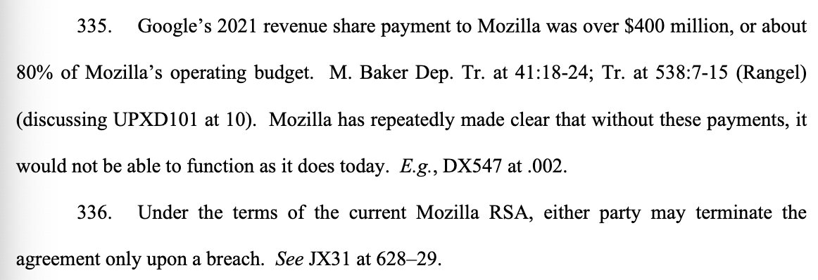 According to court documents, highlighted by @ddayen on X, Google’s 2021 revenue share payment to Mozilla exceeded $400 million, accounting for approximately “80% of Mozilla’s operating budget”. This financial arrangement has been crucial for Mozilla’s survival, with the organization stating that it would not be able to function as it does today without these payments.