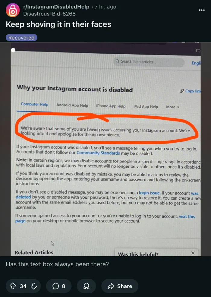 On Reddit’s r/InstagramDisabledHelp forum, users are, predictably, cautiously optimistic, yet also deeply cynical. “Keep shoving it in their faces,” one user, Disastrous-Bid-8268, posted, questioning if the text box has “always been there?” The sentiment among many is that this “half of an admission of guilt” is long overdue.