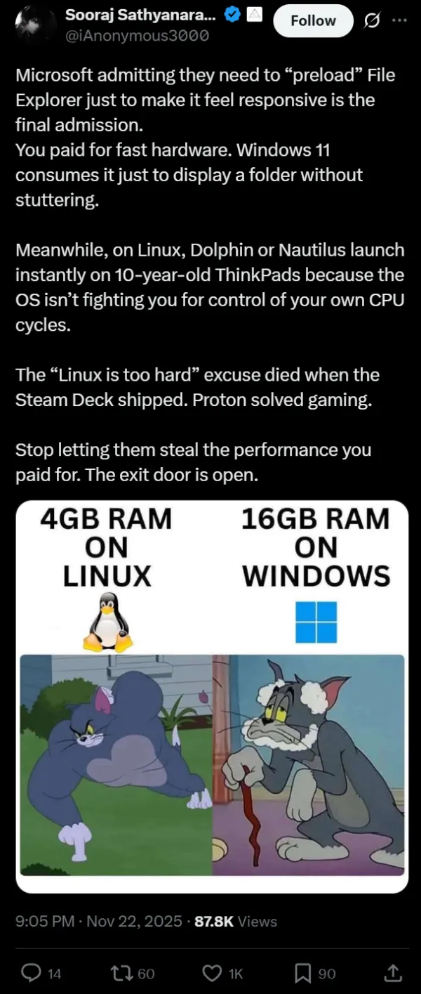 Comparisons to Linux file managers like Dolphin and Nautilus keep popping up too, with users noting those launch instantly without any preloading tricks.