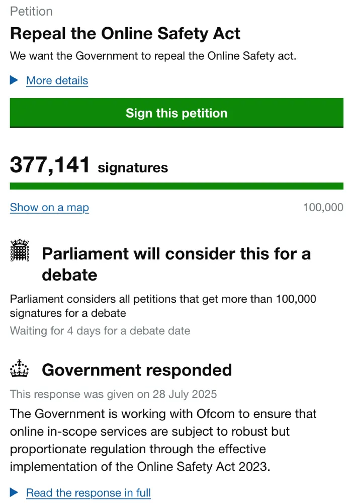 With the petition now well above the 100,000 signature threshold needed for parliamentary consideration, MPs will likely debate the future of the Online Safety Act in the coming weeks. The petition has triggered a mandatory government response and opened the door for a possible parliamentary debate, though getting 100,000 signatures is one thing and actually changing government policy is another.