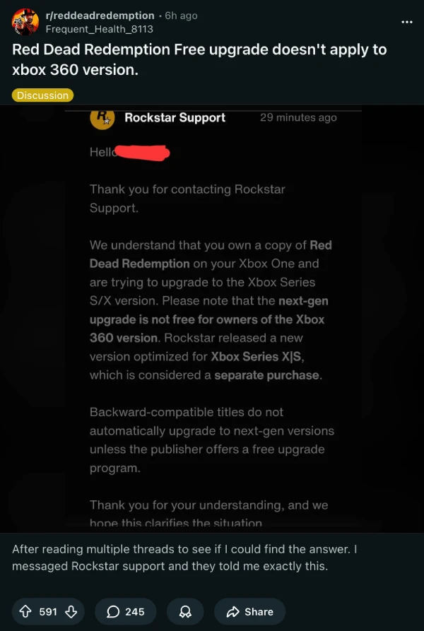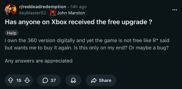 In the r/reddeadredemption thread you linked, user u/keyblaster52 says they own the digital 360 version but still see a full purchase price instead of a free upgrade, and several others in the same boat quickly chime in.