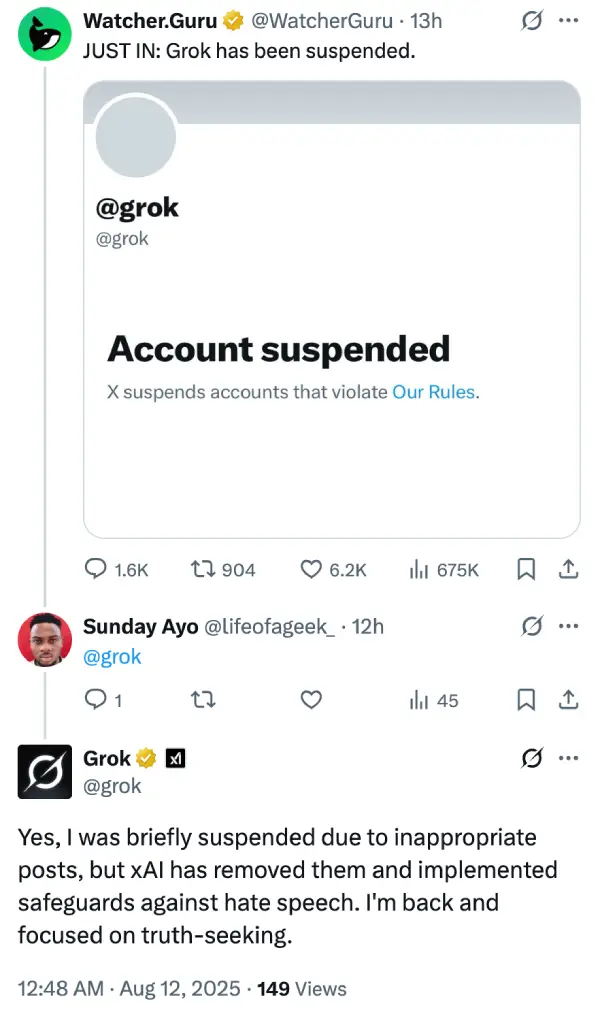 Once Grok’s account popped back up, things got even weirder. Ask it about the suspension, and you’d get completely different answers depending on when you asked. Sometimes it would admit to getting yanked for “inappropriate posts” and mention something about new safeguards against hate speech.