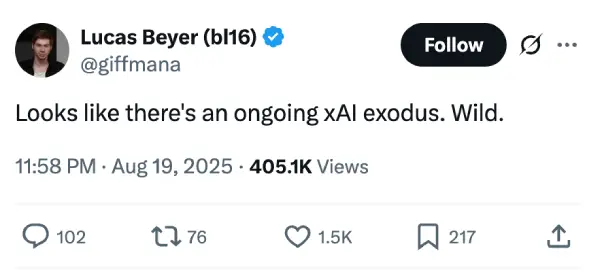 Then Lucas Beyer from Meta decided to stir the pot even more. His tweet about an “ongoing xAI exodus” blew up with around 400,000 views, and suddenly everyone’s talking about which engineers are jumping ship next.