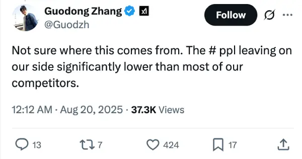 Guodong Zhang from xAI tried damage control, claiming their departure rate is lower than that of competitors.