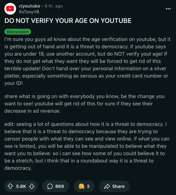 On Reddit, the top post in r/YouTube urges readers to “DO NOT VERIFY YOUR AGE” and instead cycle to a new account if they get flagged.